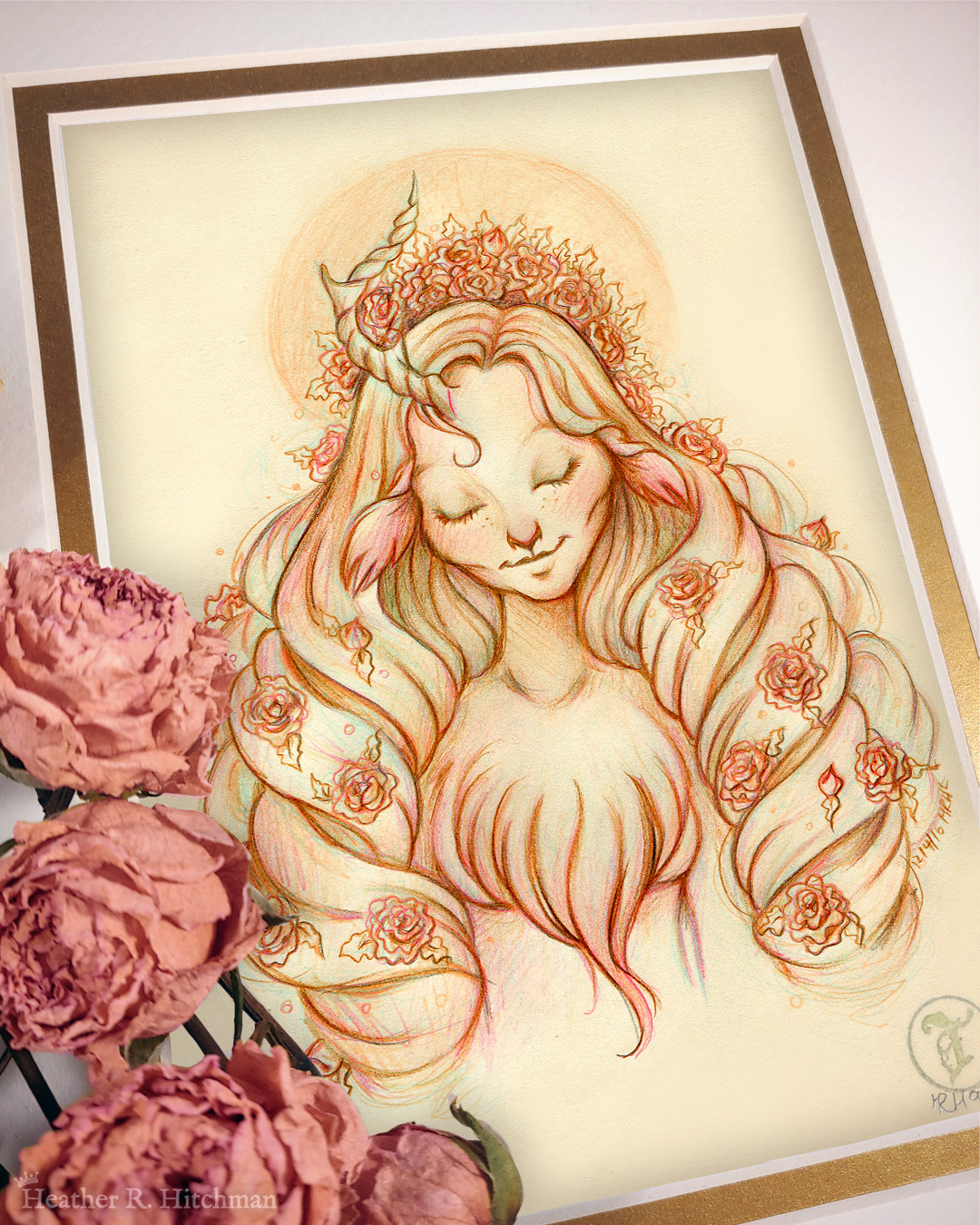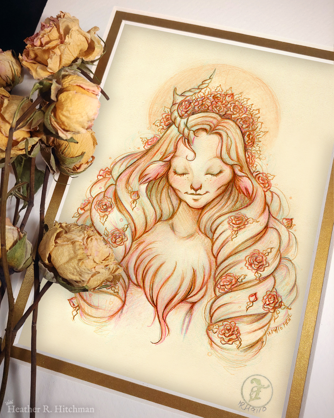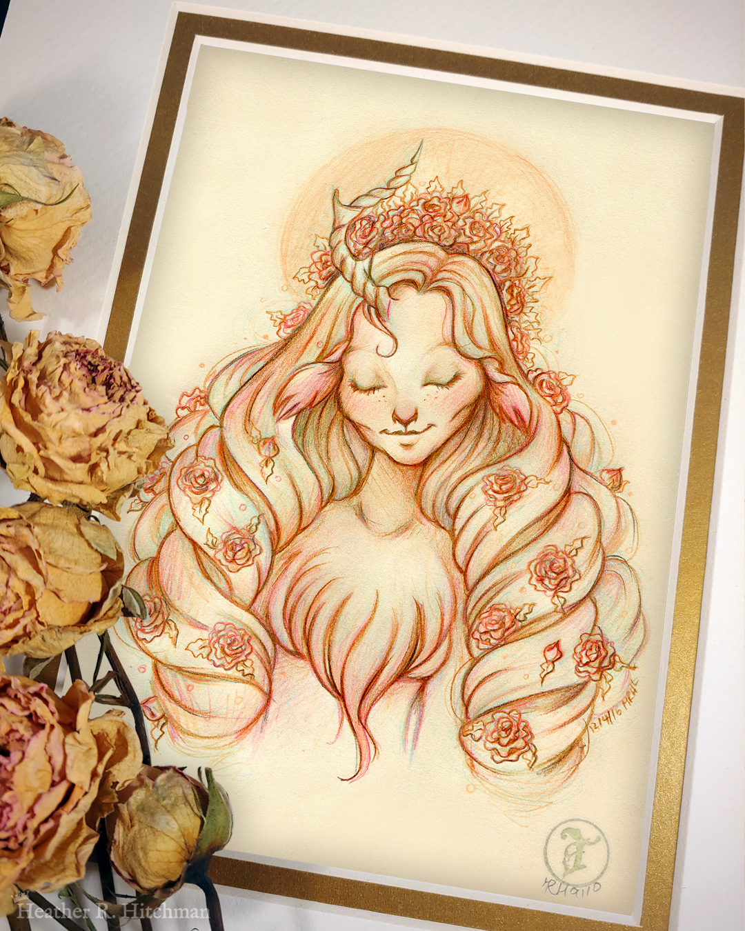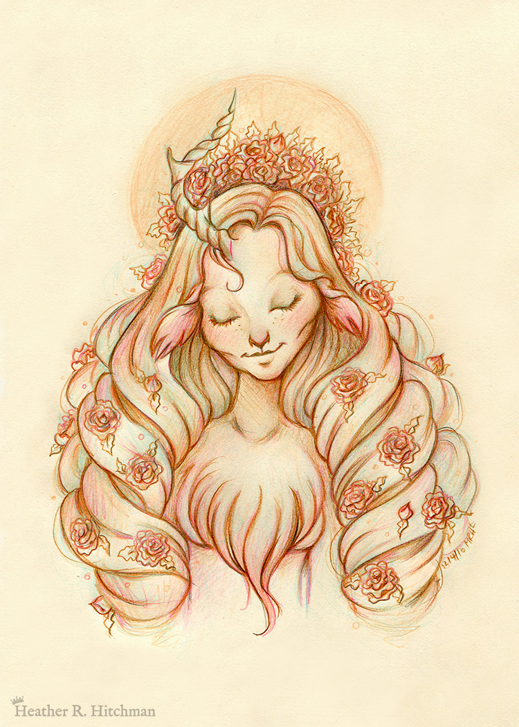 For the “Serenity” faun drawing, my process includes several steps. First, the sketch is drawn softly with a light colored mechanical pencil or graphite to draft the idea. I follow up with several shades of different wax colored pencils to add depth and a sense of atmosphere to the drawing. Then graphite is drawn on top to tighten and clean the drawing as well as add details. The colored sketch remains intact and subtly visible beneath the graphite of the final drawing. This process captures not just the final illustration, but also preserves the journey from sketch to finish with each layer of color.